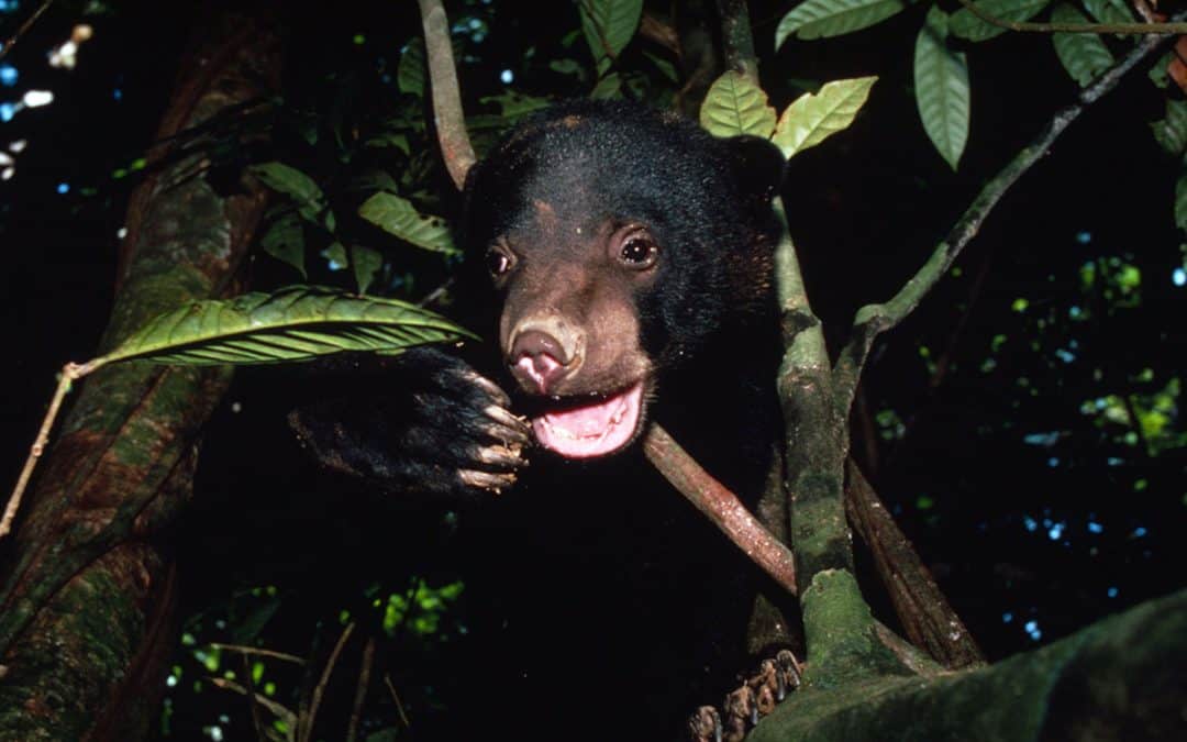 Der Malaienbär (Helarctos malayanus) ist die kleinste Art innerhalb der Familie der Großbären. Sein unverkennbares Zeichen: ein weißer bis rötlicher U-förmiger Brustfleck, dem er den Namen „Sonnenbär“ zu verdanken hat. Da Malaienbären wenig wiegen und lange starke Krallen an den Füßen besitzen, fällt es ihnen leicht, auf Bäume zu klettern. In den Baumkronen finden sie ein vielfältiges Nahrungsangebot: Früchte, aber auch Insekten, Vogeleier und Honig stehen auf ihrem Speiseplan. Dabei ist ihnen ihre bis zu 25 Zentimeter lange Zunge von großem Nutzen. Damit kommen Malaienbären auch an den Honig in tieferen Ritzen und Hohlräumen.