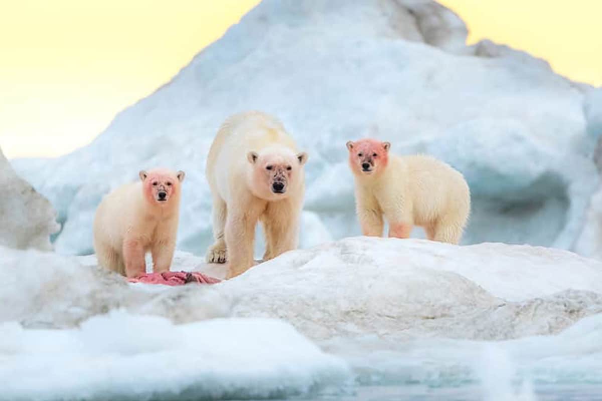 Manche Eisbären hingegen stranden auf dem eisfreien Festland. Dort gibt es nur Säugetiere, Vögel, Gras, Moos und Beeren zu fressen. Beim Hungern schrumpft ihre wichtige Speckschicht. Das ist besonders für Eisbärmütter eine große Gefahr.