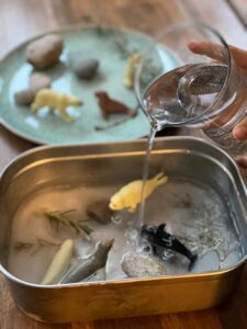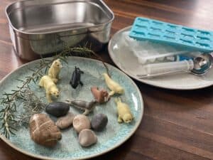 2) Ein bis zwei Stunden später kommen die ersten Tiere und Naturmaterialien hinein. Aber nicht alle – heb dir noch welche für die späteren Eisschichten auf. Lege die Figuren auf die erste Eisschicht. Fülle wieder etwas Wasser nach und stelle die Schale ins Gefrierfach. Wiederhole diesen Schritt alle paar Stunden, sodass du am Ende 4-5 Schichten hast und deine Schüssel voll ist.