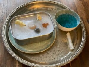 1) Bereite alles vor, was du brauchst. Fülle dann deine Schüssel (oben links im Bild) einige Zentimeter hoch mit Wasser. Wenn du magst, kannst du das Wasser auch blau färben. Und dann ab mit der Schüssel ins Gefrierfach!