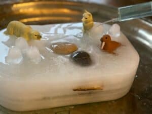 3) Die Geduld hat sich gelohnt! Unterschiedliche Schichten mit Tieren sind entstanden. Eisbär, Walross und Polarfuchs haben wir zum Schluss nur noch mit den Pfoten ins Wasser gestellt. Abschließend wurde der Eisberg mit Felsen (Steinen) geschmückt.
