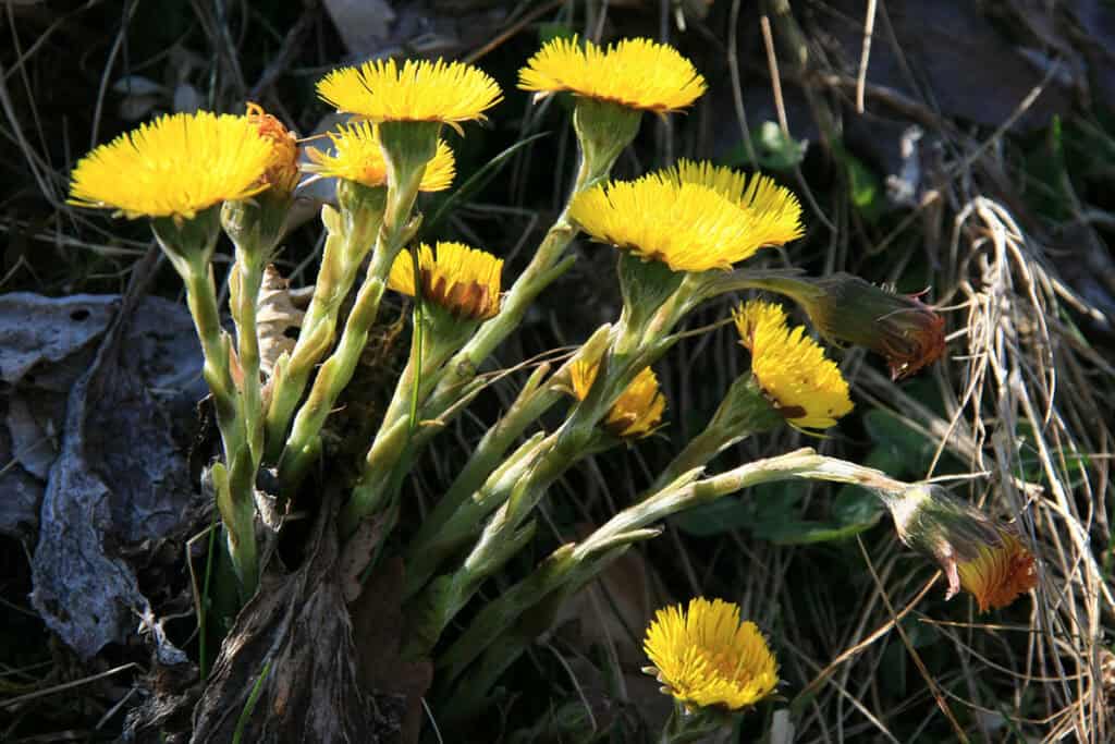 Der Huflattich blüht ab Februar oder März, manchmal noch vor den ersten anderen Blumen. Bevor der Huflattich Blätter bekommt, zeigt er seine sonnengelben Blüten. Man sieht ihn oft an Wegrändern oder auf kahlen Flächen. Seine Blätter bekommt er erst später im Jahr.