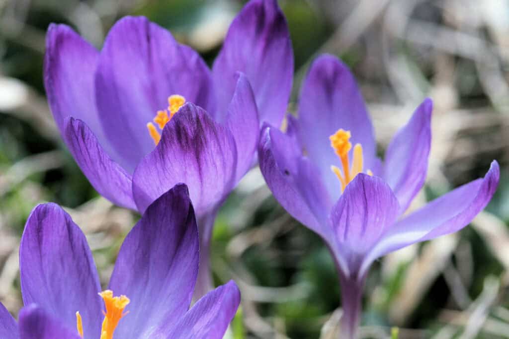 Krokusse sind echte Frühlingsboten. Es gibt sie in violett, gelb und weiß, manchmal auch in blau oder rosa. Auch sie blühen ab Februar oder März auf Wiesen oder in den Bergen und dienen Bienen und Hummeln als erste Nahrungsquelle.