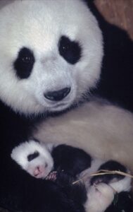 Pandas bekommen alle zwei bis drei Jahre meist nur ein einziges Junges. Sie bringen den Nachwuchs in einem selbstgebauten Nest in einem hohlen Baumstamm oder einer Felshöhle zur Welt. Die Babies kommen nackt und blind zur Welt und sind ohne Fell noch ganz rosa.