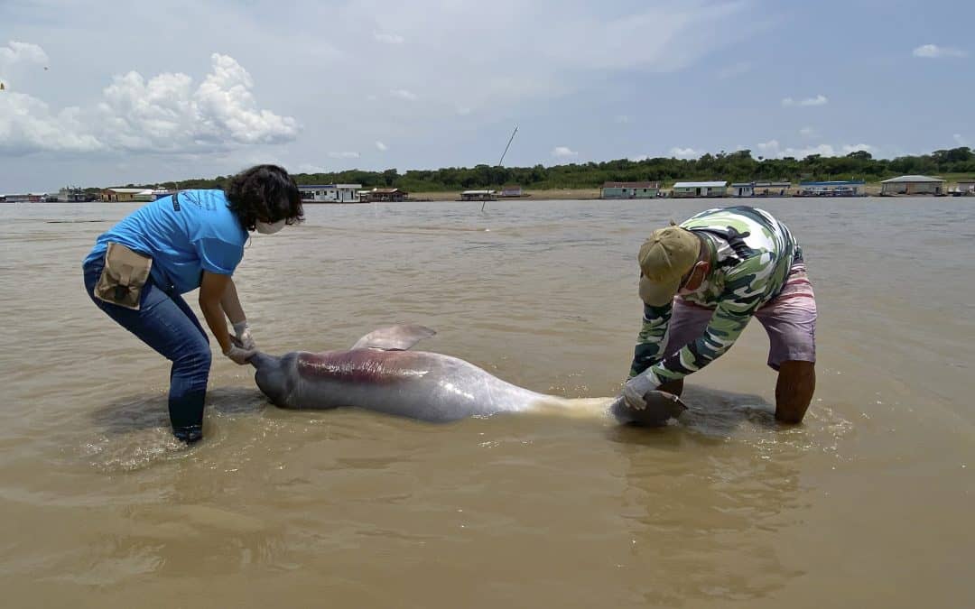 Noch lebende Delfine bergen: Der WWF und Expert:innen vom staatlichen Mamirauá-Institut bringen geschwächte Tiere von den Flachwasserzonen des Sees in tiefere Gewässer. Dort haben die Flussdelfine eine höhere Überlebenschance. Diese Bergungen sind extrem aufwändig und teuer. Ein Transport in nahegelegene Flüsse ist leider nur bedingt sinnvoll, weil auch dort die Überlebenschancen kaum besser sind.