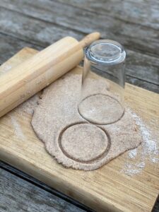 2) Rolle die Kugeln mit einem Teigroller etwa 1,5 cm dick aus. Danach stichst du mit einem Glas oder Keksausstecher die Scheiben aus. Oben kommt ein Loch hinein. Das kannst du mit einem umgedrehten Bleistift stechen.