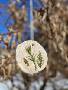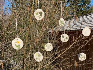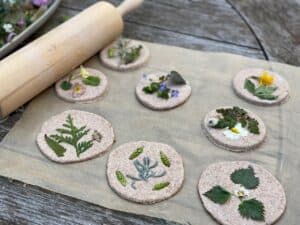 3) Lege die Blätter und Blüten vorsichtig auf und walke sie mit dem Teigroller leicht ein, sodass sie gut haften bleiben. Pass auf, dass die Formen nicht zu dünn werden. Lass die Anhänger anschließend ein paar Stunden “trocknen”. Dadurch wird der Teig hart.