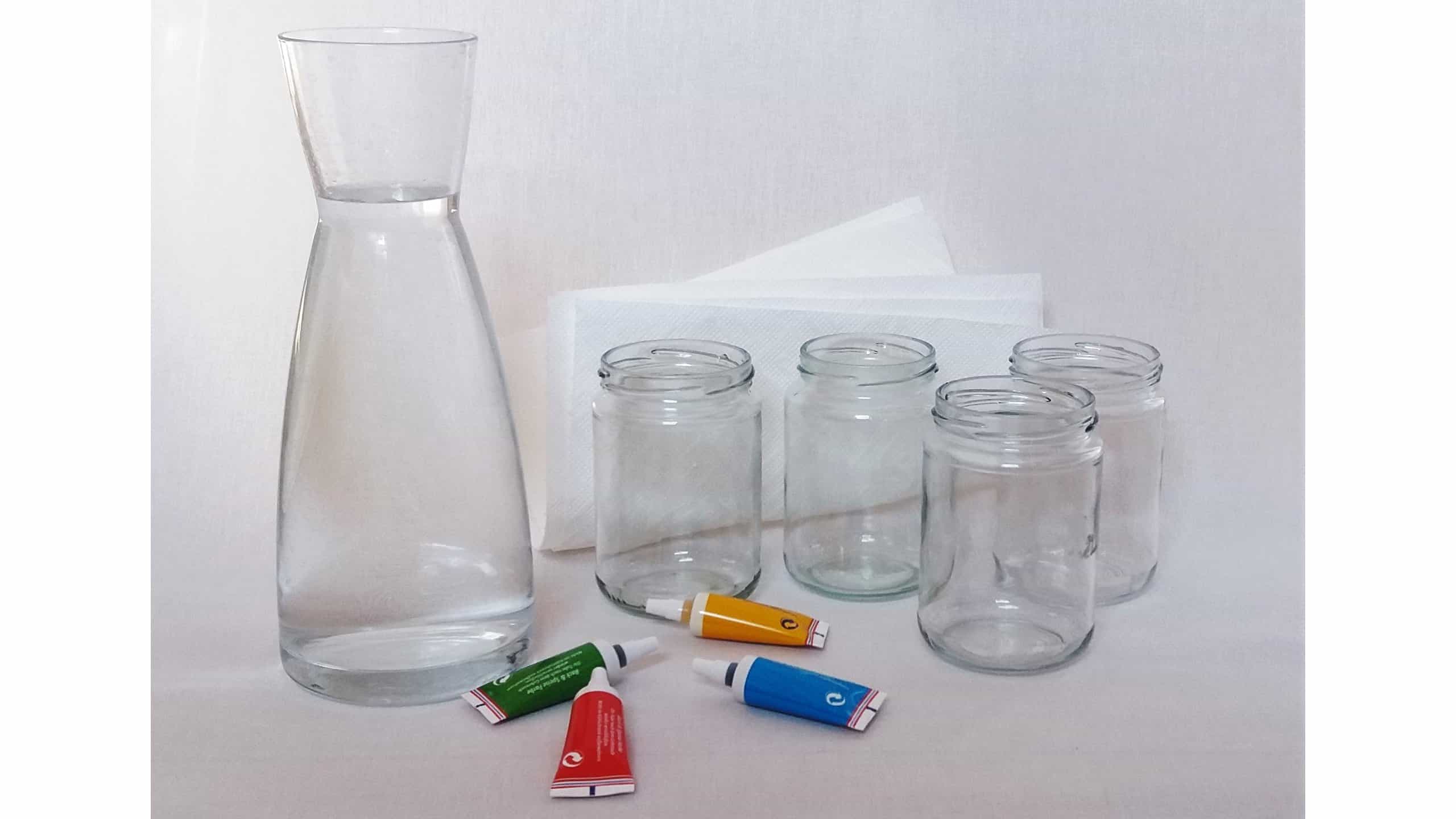 Fülle drei Gläser etwa halb voll mit Wasser und färbe je eines mit der blauen, eines mit der roten und eines mit der gelben Lebensmittelfarbe. Anschließend stellst du die Gläser im Kreis auf, immer abwechselnd ein volles und ein leeres Glas.