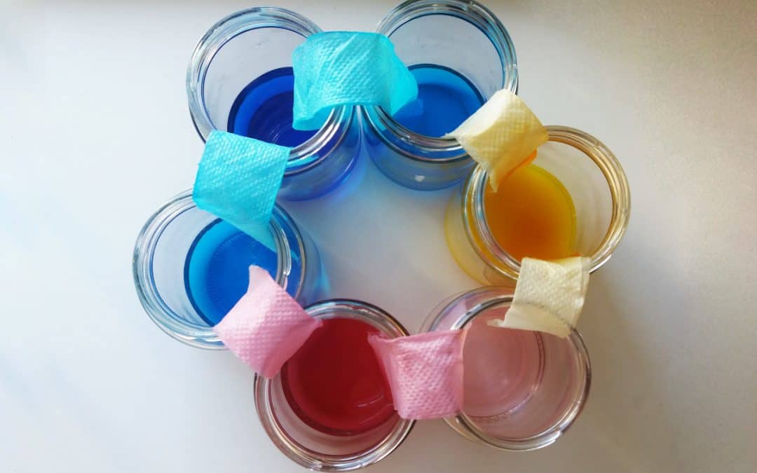 Bald kannst du etwas Spannendes beobachten: Das gefärbte Wasser wandert gaaaaanz laaaaangsam die Küchenrolle entlang und füllt so mit der Zeit die leeren Gläser. Gleichzeitig entstehen in den leeren Gläsern neue Farbmischungen! Cool, oder?