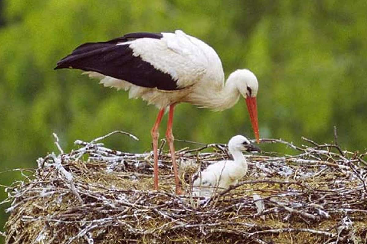 Weißstörche – besucht die Familie Adebar! Der Aussichtsturm links hinter dem Schloss ist perfekt, um Störche beim Brüten zu beobachten. Ein Elternteil sitzt bei den Küken im Nest, während der andere mit Futter angeflogen kommt. Zur Begrüßung wird der Kopf nach hinten geworfen und laut mit dem Schnabel geklappert! Die Störche könnt ihr zwischen März und August sehen. In unserem Wissensblatt erfährst du mehr!