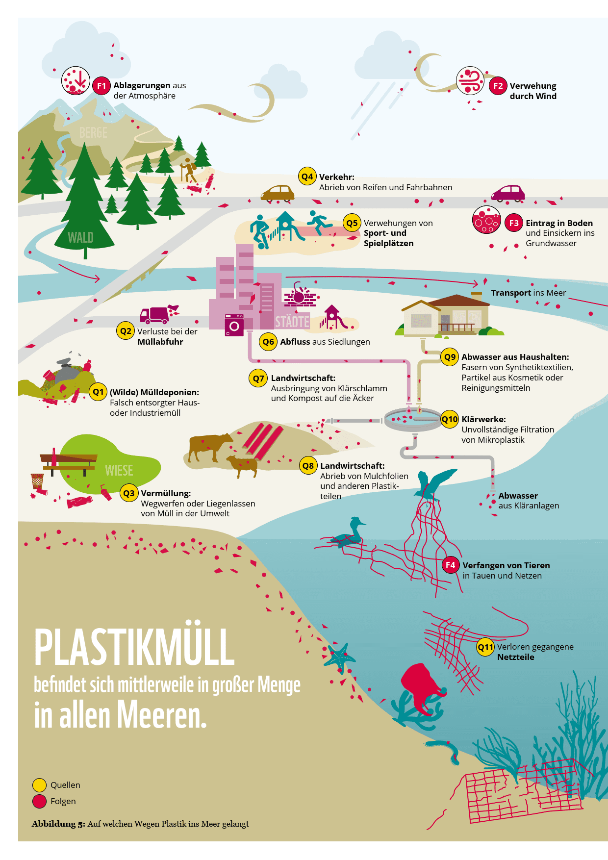 Plastik ist so beliebt, weil es sehr lange haltbar ist. Gelangt es jedoch in die Natur, wird genau zum Problem. Plastik wird nicht biologisch abgebaut, wie zum Beispiel Blätter oder Apfelschalen . Es zerfällt in kleine Teile, so genanntes Mikroplastik. Dieses verteilt sich in der Luft, im Wasser und reichert sich sogar in unserem Körper an. Deshalb ist es besonders wichtig, darauf zu achten, dass kein Plastik in die Umwelt gelangt. Eine achtlos weggeworfene Plastikflasche kann vom Wind in den nächsten Fluss und von dort ins Meer getragen werden. Hier siehst du, wo sich überall Plastik befindet: