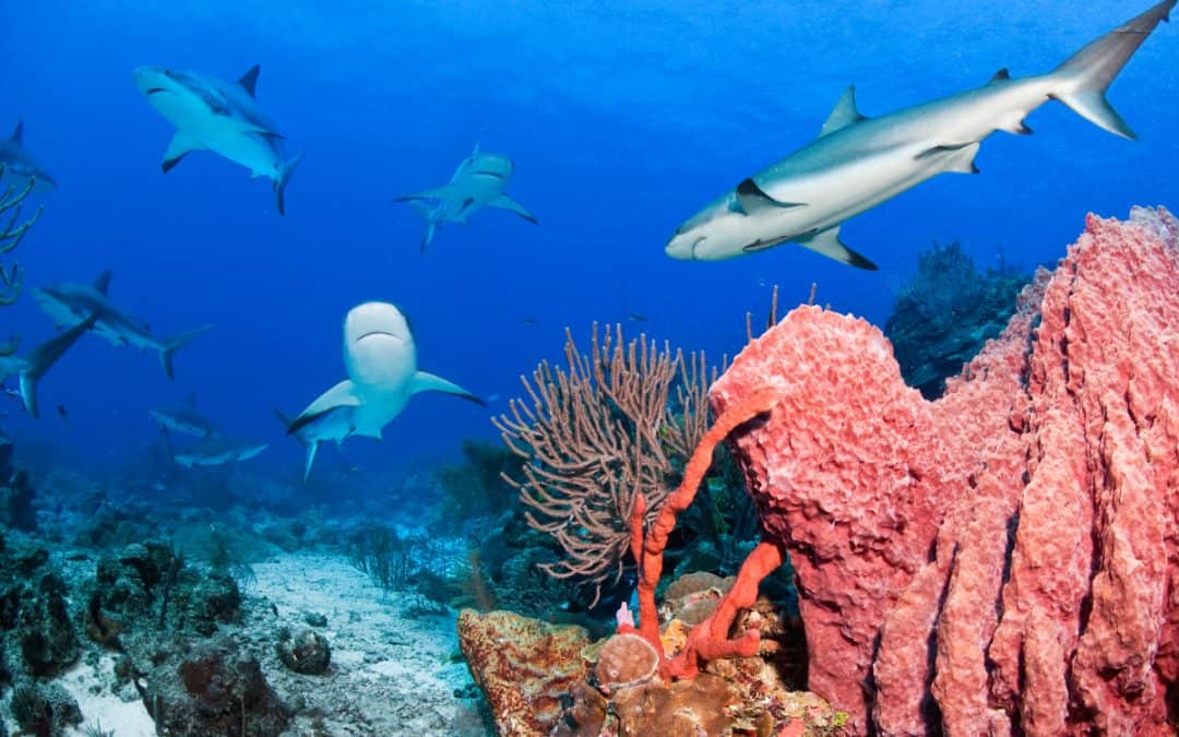 R) Haie halten die Menge der Fische im Gleichgewicht.