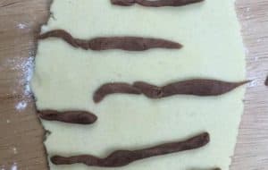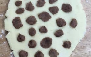 - Mit dem Schoko-Teig legst du jetzt das Tiermuster auf den weißen Teig. Kleine Kreise für Giraffen-Flecken und kleine Halbkreise für Geparden-Muster, kleine Rollen für Tiger und etwas breitere Streifen für Zebras.