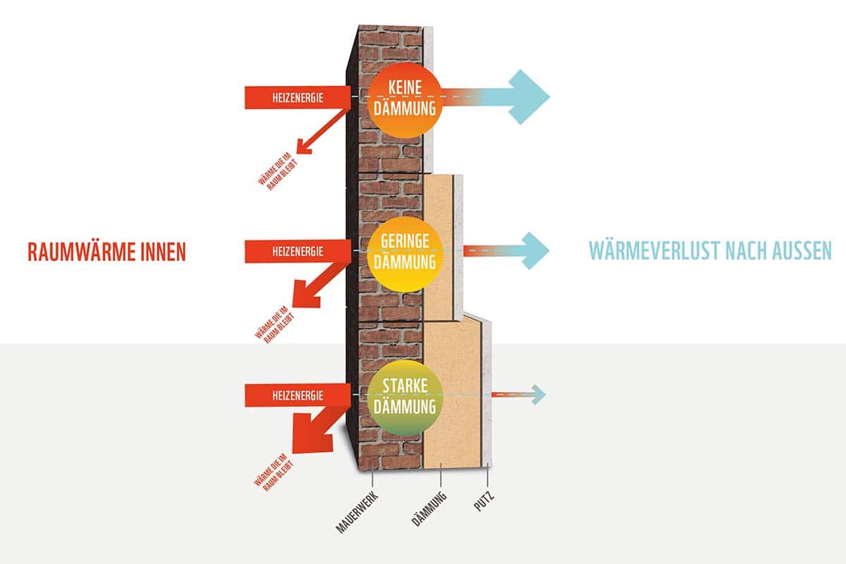 Die Wärmedämmung von Außenwänden wird im Regelfall mit einer Fassaden-Erneuerung verbunden. Eine Dämmstärke von 10 bis 20 cm wird empfohlen. Die genaue Dämmstärke wird bei der Energieberatung berechnet.