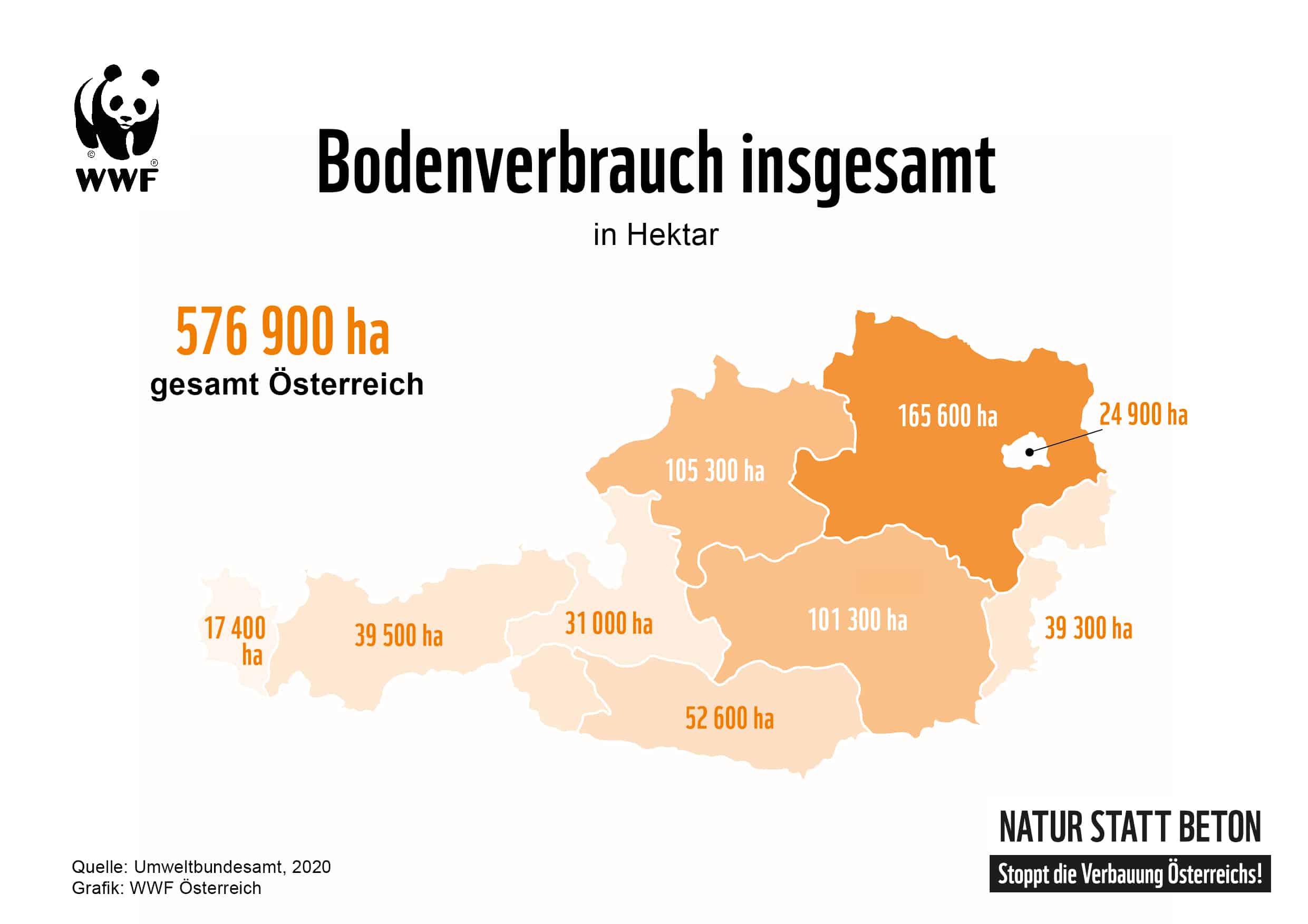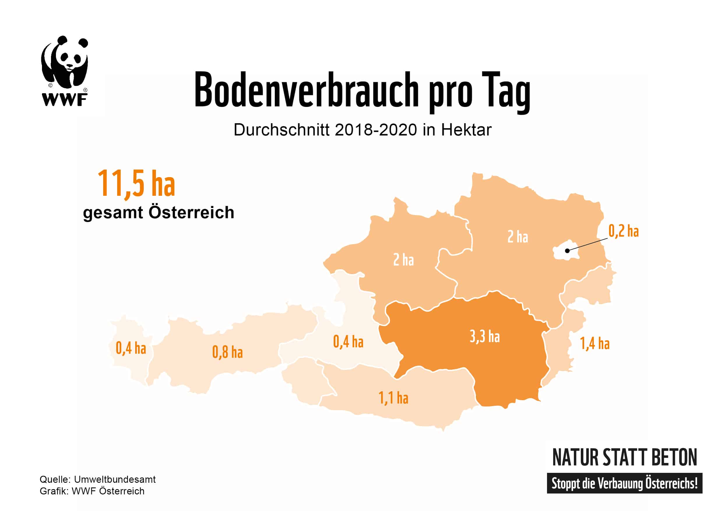 Angesichts des bevorstehenden Bodenschutzgipfels von Bund, Ländern und Gemeinden am 20. Oktober weist die Naturschutzorganisation WWF Österreich in einer neuen Analyse auf den besonders hohen Bodenverbrauch der Bundesländer hin und fordert verbindliche Maßnahmen, um den Flächenfraß zu begrenzen. „Mit einem Bodenverbrauch von durchschnittlich 11,5 Hektar pro Tag verbaut Österreich mehr als das Vierfache des Nachhaltigkeitsziels des Bundes. Insgesamt ist in Österreich bereits eine Fläche von knapp 576.900 Hektar produktiver Böden verloren gegangen – was mehr als der doppelten Fläche des Bundeslandes Vorarlberg entspricht. Bodenfressende Mega-Projekte wie die überholte Lobau-Autobahn oder die Erweiterung des Skigebiets Vorderstoder zeigen, dass es nach wie vor kein Umdenken gibt“, kritisiert WWF-Bodenschutzsprecherin Maria Schachinger und fordert einen verbindlichen Bodenschutzvertrag für ganz Österreich sowie ein umfassendes Maßnahmenpaket auf allen Ebenen. „Bundeskanzler Alexander Schallenberg muss daher als ständiger Vorsitzender der Raumordnungskonferenz beim Bodenschutz-Gipfel für eine verbindliche Obergrenze beim Flächenfraß eintreten“, fordert Maria Schachinger.