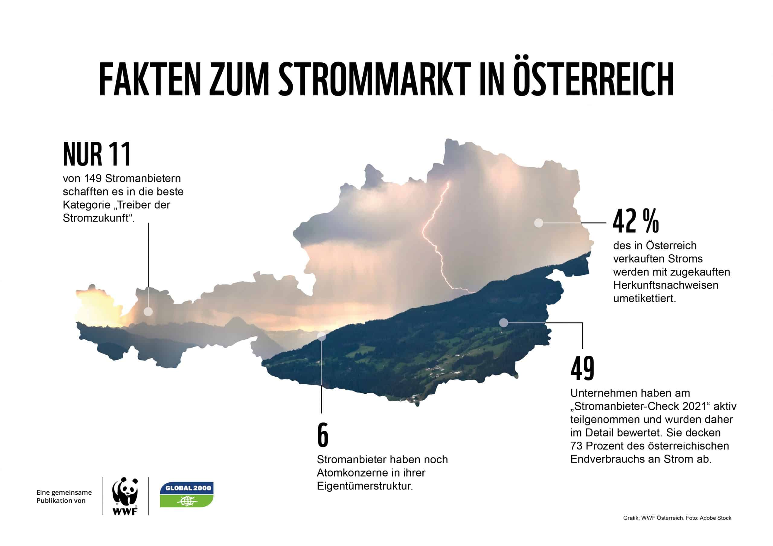 Im Stromanbieter-Check 2021 bewerten GLOBAL 2000 und der WWF Österreich zusätzlich zu den gesetzlich vorgeschriebenen Mindestanforderungen der Stromkennzeichnung – wie dem Grünstromanteil und dem Einsatz heimischer Nachweise – die Unternehmensstrategie ganzheitlich, den Ausbau von Erneuerbaren Energien, die Naturverträglichkeit der Kraftwerke, die Netzdienlichkeit sowie Energiespar-Anstrengungen. „Mit unserem Ranking steigt die Transparenz deutlich. Damit können Stromkundinnen und Stromkunden selbst entscheiden, ob ihr Geld eine naturverträgliche Stromzukunft vorantreibt oder sich hinter einer grünen Fassade doch noch Kohlekraftwerke oder Atomkraftwerke verstecken“, sagt Reinhard Uhrig. WWF-Energiesprecher Karl Schellmann fügt hinzu: „Wir brauchen einen transparenten Markt, damit sich die Menschen für echten Ökostrom entscheiden können. Nur so kann auch die Transformation des Strommarktes gelingen.“