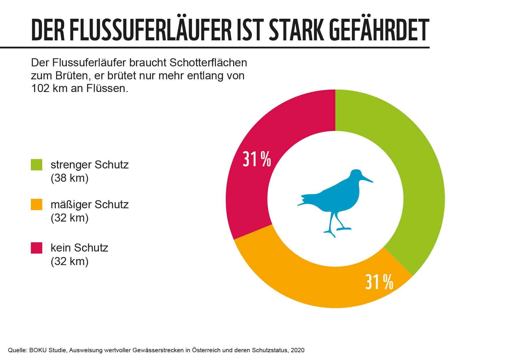 •Der Flussuferläufer brütet nur mehr auf 0,3 Prozent der Fließgewässerstrecken (100 Kilometer), davon sind nur 38 Kilometer streng geschützt.