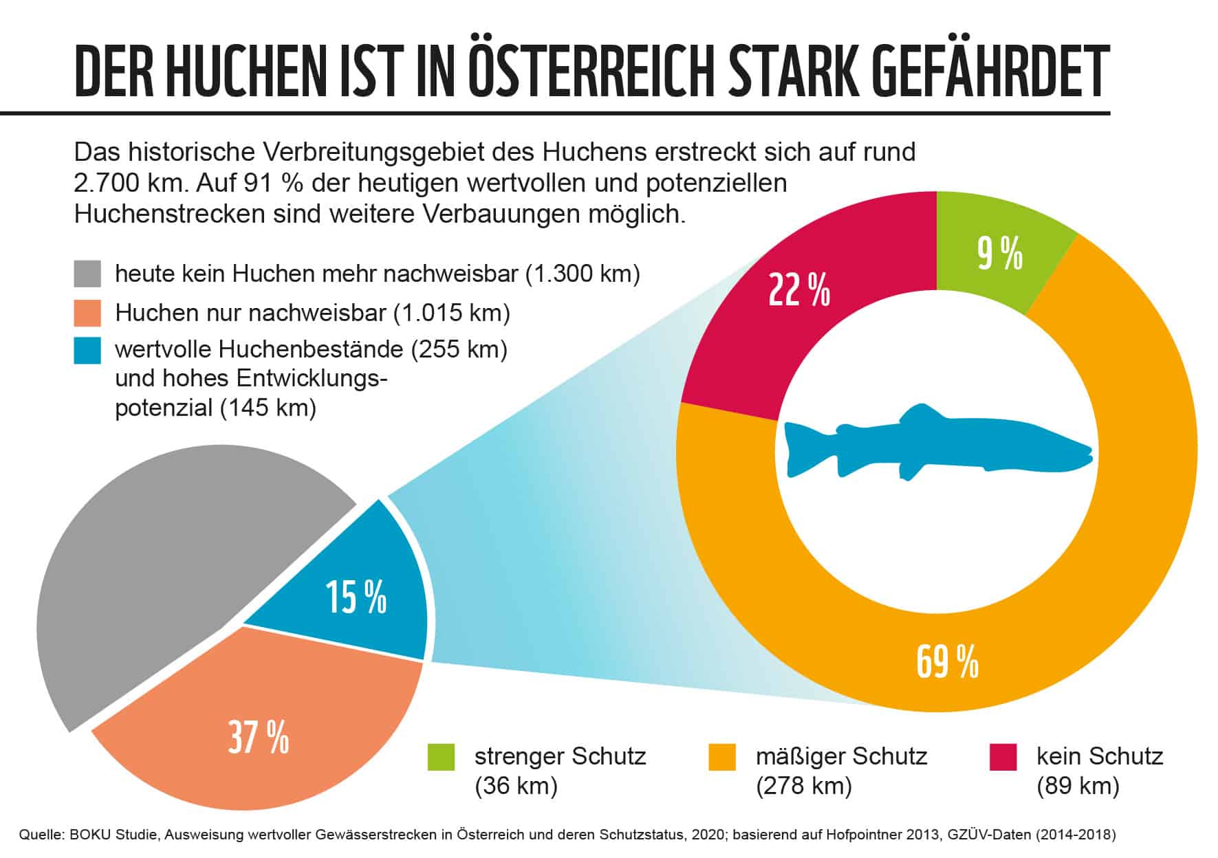 •Für den stark gefährdeten Huchen, den größten lachsartigen Fisch Europas, besteht die reale Gefahr, dass er in den nächsten 20 Jahren in Österreich ausstirbt. Er kommt nur noch auf rund 50 Prozent (2.700 Kilometer) des ehemaligen Verbreitungsgebiets vor, nur auf 20 Prozent kann er sich natürlich fortpflanzen. Gute Bestände oder hohes Entwicklungspotenzial gibt es nur noch auf rund 400 Flusskilometern. Davon sind nur 9 Prozent streng geschützt;