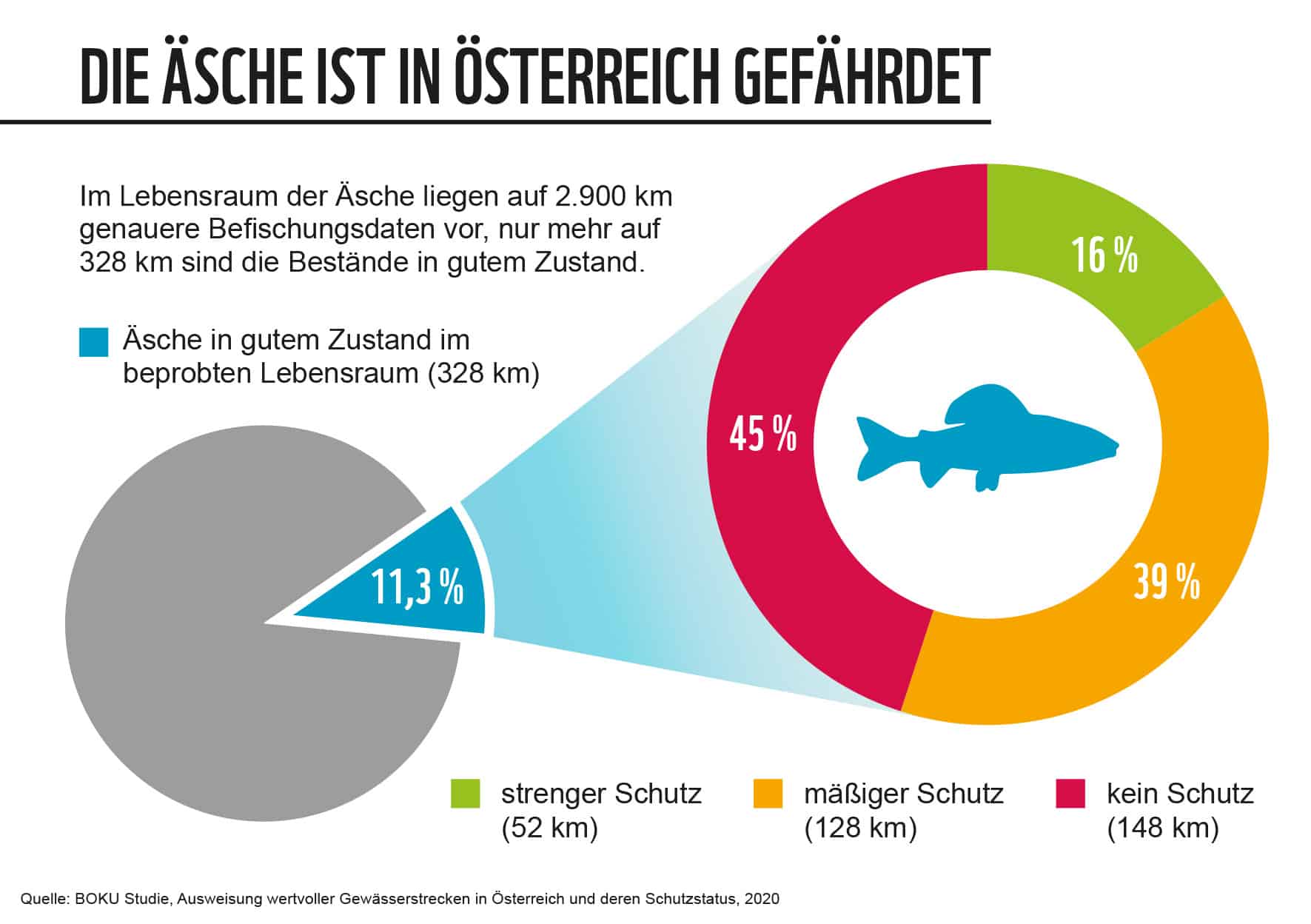 Laut Studie liegen für die gefährdete Äsche, die noch auf rund 5.000 Kilometern vorkommt, auf 2.900 Kilometern genauere Befischungsdaten vor. Nur mehr auf 330 Kilometern sind die Bestände in gutem Zustand. Nur 16 Prozent (50 Kilometer) dieser intakten Bestände sind vor weiterer Verbauung streng geschützt. Beim stark gefährdeten Huchen gibt es überhaupt nur noch 403 Kilometer mit gutem Bestand oder zumindest gutem Potenzial. Nur neun Prozent dieser Strecken sind streng geschützt. Beim Flussuferläufer, der auf Schotterbänken nistet, konnten Brutvorkommen nur noch auf 97 Flusskilometern dokumentiert werden.