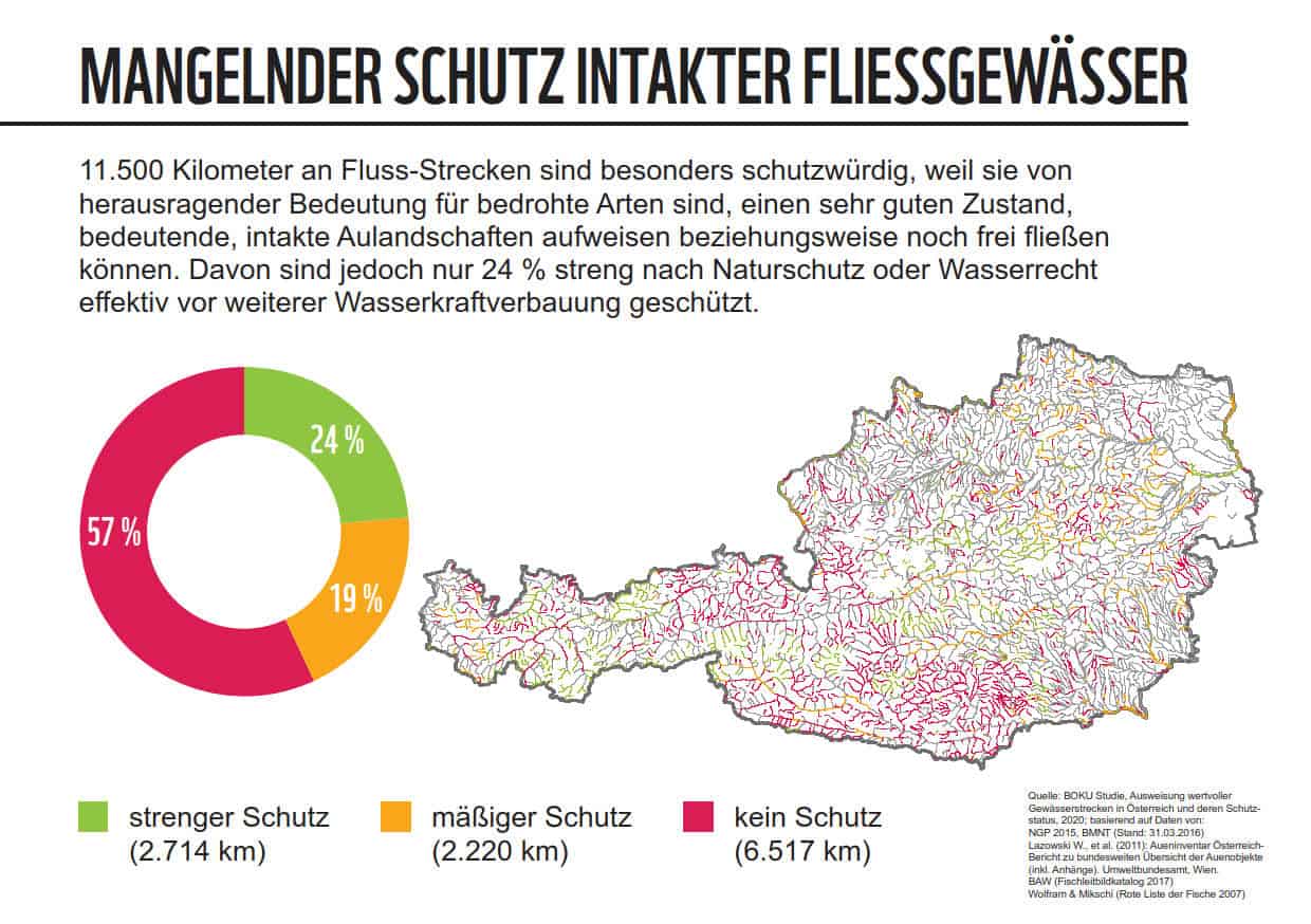 Die BOKU-Analyse zur „Ausweisung wertvoller Gewässerstrecken in Österreich und deren Schutzstatus“ hat 32.267 Flusskilometer untersucht. Rund ein Drittel aller Strecken (ca. 11.500 Kilometer) wurde „als besonders schutzwürdig“ eingestuft. Zusätzlich zu den dramatischen Rückgängen von ikonischen heimischen Flusslebewesen belegt die Studie einen mangelhaften Schutz vor weiteren Verschlechterungen. Die Untersuchung ausgewählter Indikator-Arten und deren Lebensraum ergibt ein besorgniserregendes Bild. Projektleiterin Sigrid Scheikl von der Universität für Bodenkultur erklärt: „Von den 58 heimischen Fischarten, die heute noch in Fließgewässern anzutreffen sind, sind 34 entweder gefährdet, stark gefährdet oder sogar vom Aussterben bedroht. In der Studie haben wir 11.500 Kilometer an Fluss-Strecken als besonders schutzwürdig identifiziert, weil sie von herausragender Bedeutung für bedrohte Arten sind, einen sehr guten Zustand oder noch intakte Aulandschaften aufweisen beziehungsweise freie Fließstrecken sind. Davon sind jedoch nur 24 Prozent streng nach Naturschutz oder Wasserrecht effektiv vor weiterer Wasserkraftverbauung geschützt.“